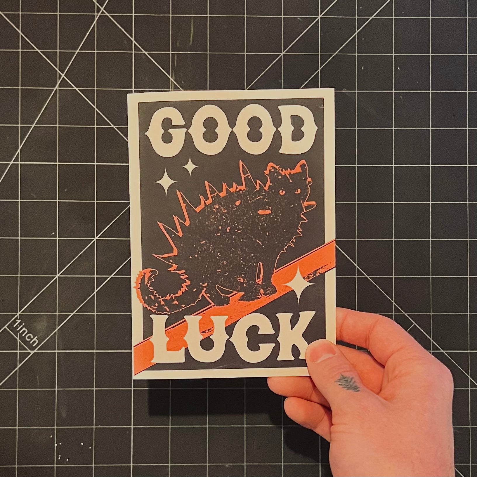 A spooky little black cat wishing "good luck" to that special someone. A6-sized greeting card (6.25" x 4.5"), blank inside, with white envelope. High quality inkjet print on ultra heavyweight cardstock.