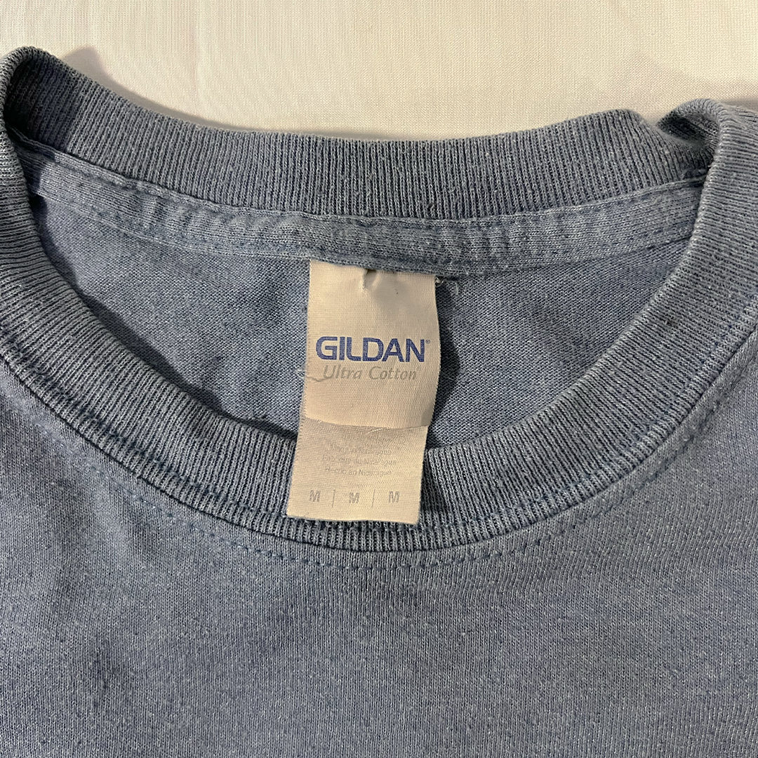 "I GOT THAT DOG IN ME" screen printed by hand in-house on a medium heather blue 2000s Gildan Ultra Cotton tee.