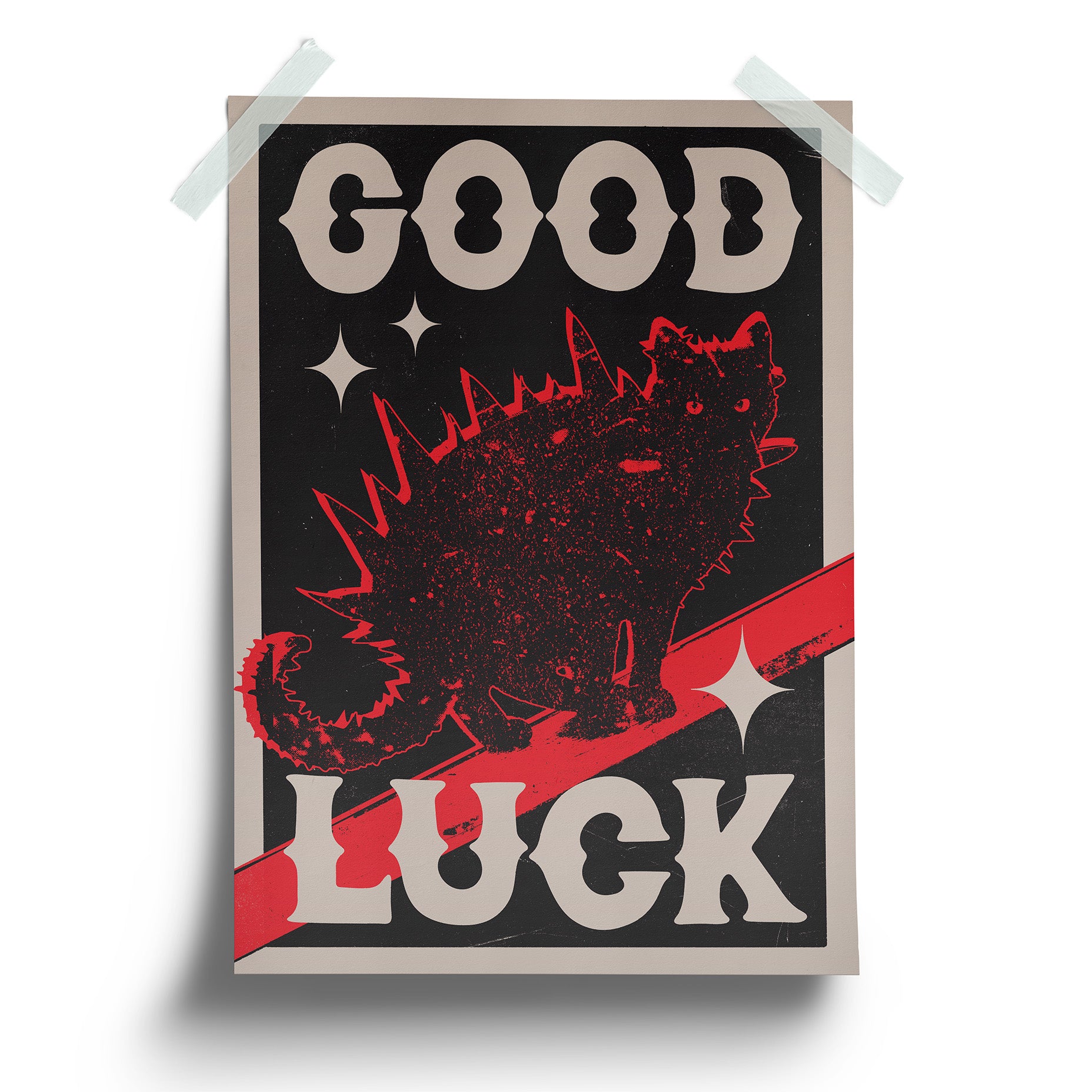 A spooky little black cat poster design as a high quality inkjet print on heavyweight mixed media paper, available in A3, A4 or A5 sizes (size guide below).